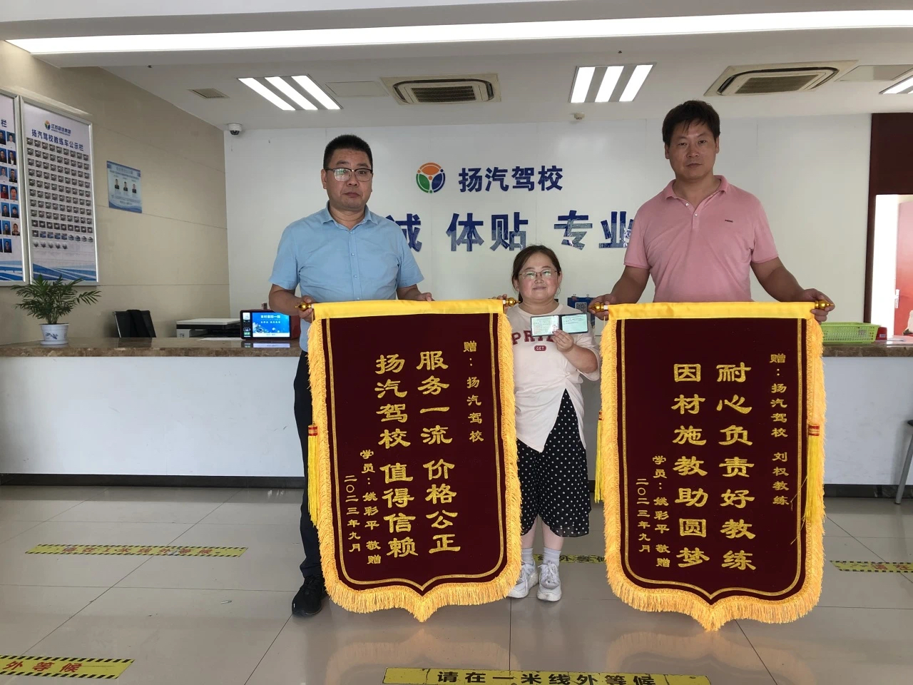 9月27日上午,在扬汽驾校西部枢纽招生大厅内,昨天刚取得C2驾照的学员姚彩平,将“服务一流、价格公正、扬汽驾校、值得信赖”、“耐心负责好教练、因材施教助圆梦”两面锦旗送到了扬汽驾校主任顾军和她的教练刘权的手上,感谢驾校工作人员和教练在她学车期间的认真教学、辛苦付出。