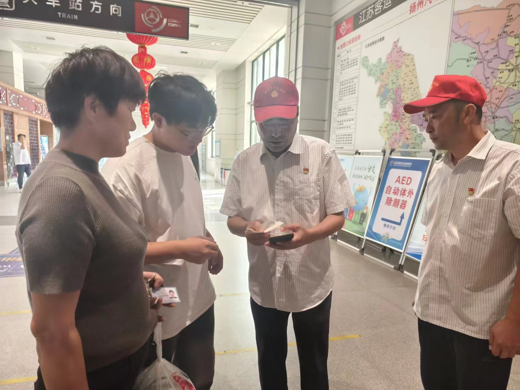 志愿者们有序在车站的售票厅、候车厅、安检处、发车平台等岗位为旅客提供文明劝导、秩序维护、行李搬运、茶水服务等志愿服务,并耐心解答旅客的每一个问题,细心指引旅客前往购票窗口、候车区、检票口等关键位置,确保每一位旅客都能顺利、愉快地踏上旅程。针对老弱病残孕等重点旅游群体,志愿者们热情为其提供“一对一”重点帮扶,全力保障旅客群体安全便捷出行。在扬州汽车站候车大厅、汽车东站服务台均设立了党员示范岗,党员志愿者们亮明身份,主动接受旅客监督。