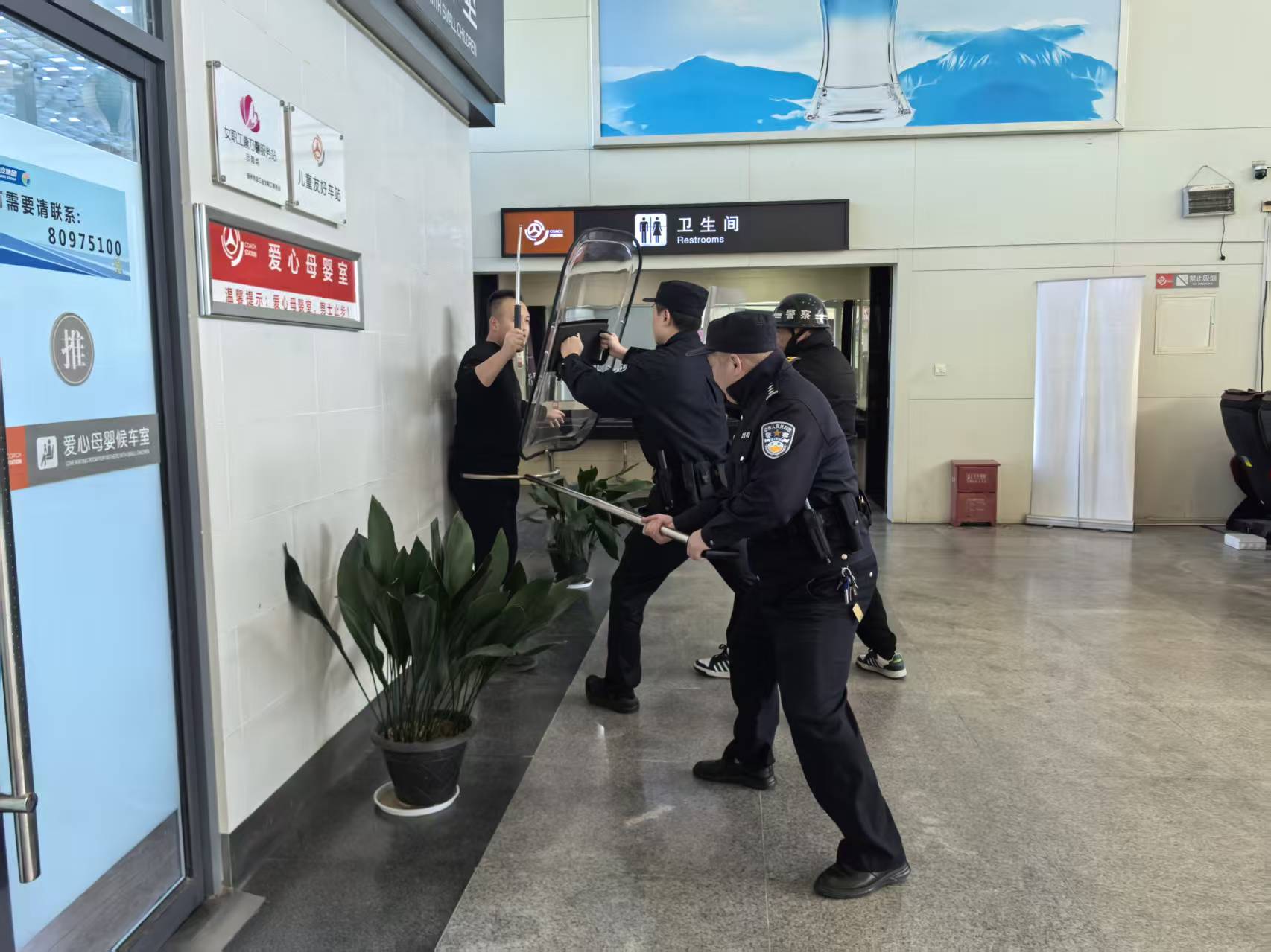“各位旅客请注意,进站口发生紧急情况,请听从工作人员指挥有序疏散!”上午10时左右,伴随警报声响起,演练正式开始。模拟场景中,一名“暴恐分子”持刀具企图闯入候车大厅。安检员立即启动一键报警装置,并向指挥中心报告。派出所接警后,巡逻民警在3分钟内到达现场,使用防暴器械对“暴恐分子”进行包围控制。在其持续反抗的情况下,民警果断运用“盾棍协同、分割围堵”战术,成功将其制服并带离。